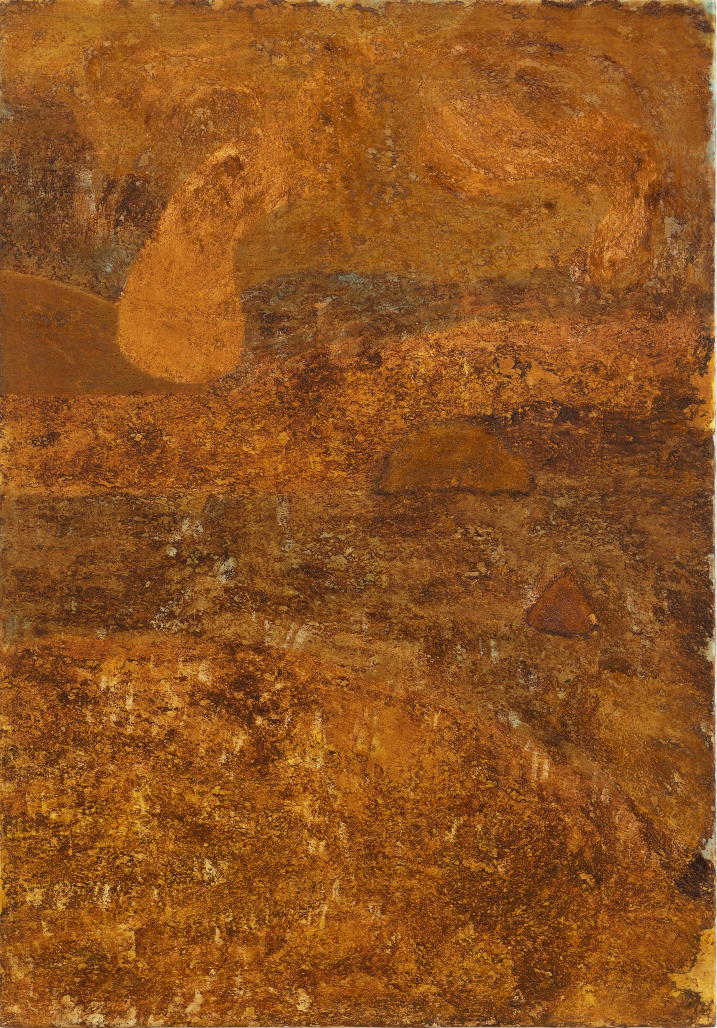 Paintings were made using encaustic medium and pigments to portrait landscapes. Steel was then rusted on top of these landscapes covering them with dust.